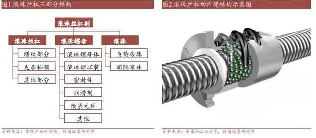 滾珠絲杠,又名滾珠絲杠副,是工業(yè)精密機(jī)械中常用的傳動元件,其主要結(jié)構(gòu)包括滾珠絲杠、滾珠螺母、滾珠三部分。滾珠絲杠軸為螺母運(yùn)動的導(dǎo)向軸,其表面具有螺紋,滾珠在螺紋內(nèi)運(yùn)動。螺母由預(yù)壓片、反向器、防塵器等組成,是直線運(yùn)動的移動體,帶動滾珠循環(huán)機(jī)制;其端部密封件用于封裝潤滑零件、防止異物進(jìn)入。滾珠是利用低摩擦系數(shù)維持整個零部件運(yùn)轉(zhuǎn)的媒介,存在外循環(huán)、內(nèi)循環(huán)兩種循環(huán)方式。