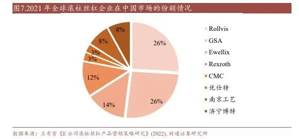 從我國滾動功能部件的市場格局來看,日本、歐洲企業(yè)主導(dǎo)高端市場,中國企業(yè)仍有進(jìn)步空間。根據(jù)金屬加工公眾號信息,在國內(nèi)滾動功能部件的高端市場,日本、歐洲企業(yè)合計(jì)市場份額高達(dá) 90%,中國大陸、中國臺灣企業(yè)市場份額各約5%,高端市場格局相對集中;在國內(nèi)滾動功能部件的中低端市場,中國大陸廠商的市場份額約 30%。根據(jù)王有雪論文《E 公司滾柱絲杠產(chǎn)品營銷策略研究》論述,2021 年我國行星滾柱絲杠市場供應(yīng)量排名前四的廠家分別是 Rollvis(瑞士)、GSA(瑞士)、Ewellix(瑞典)Rexroth(德國),市占率分別為 26%、26%、14%,12%。對于行星滾柱絲杠,由于市場較小,行業(yè)參與者主要以海外企業(yè)為主,主要包括斯凱孚、GSA、伊維萊(Ewellix)、博世力士樂等。